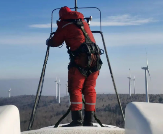 負責檢修的工作人員戴好安全帽、穿好安全衣、安全帶,佩戴好速差防墜器后,把防墜落安全鎖扣安裝在了爬梯上。在助爬器助力下,他們登上了75米高的風機,整個攀爬過程異常艱險,爬梯被冰雪覆蓋,非常光滑,稍有不慎就有可能從高空中墜落。